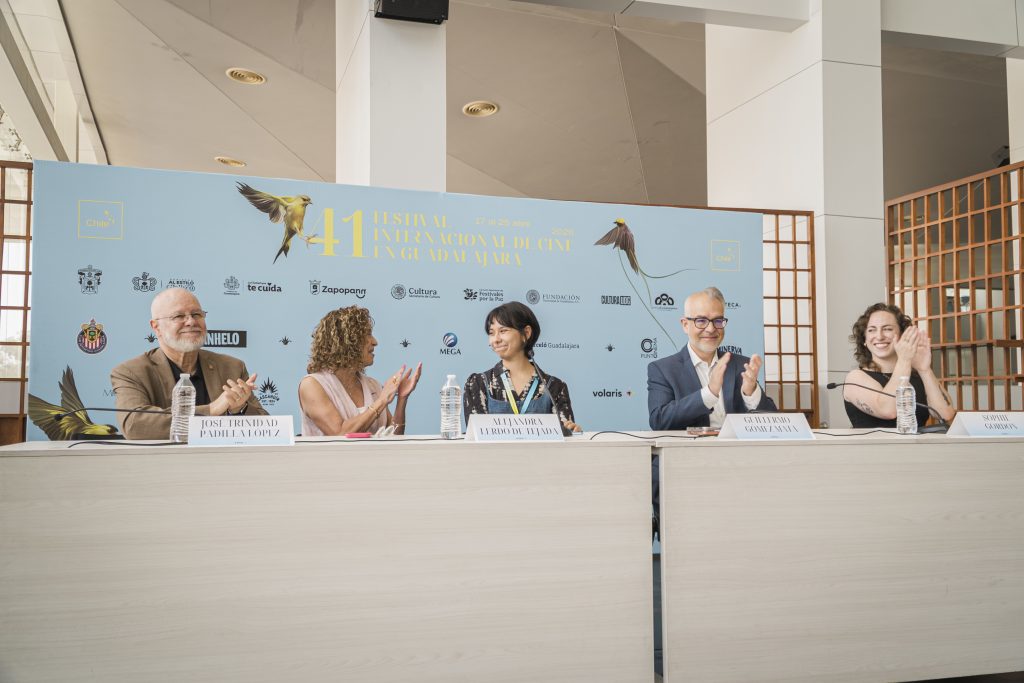 El presídium para dar a conocer la gran noticia fue conformado por Guillermo Gómez Mata, presidente del Patronato del FICG; José Trinidad Padilla López, presidente de la Fundación Universidad de Guadalajara; Sophie Gordon, representante del jurado de la Beca Jenkins-Del Toro 2026; y Alejandra Lerdo de Tejada, directora de Comunicación de la Fundación Jenkins.